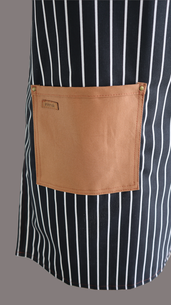 DESCRIPCIÓN: Delantal de cuerpo completo en tela twill de algodón estampado de lineas y detalles en tela twill color caramelo con correas en negro. Diseño en material liviano con bolsillo funcionales perfecto para el día a dia. Disponible en largo de rodilla y largo mitad de muslo.