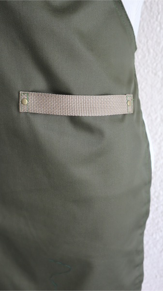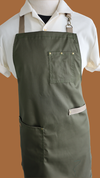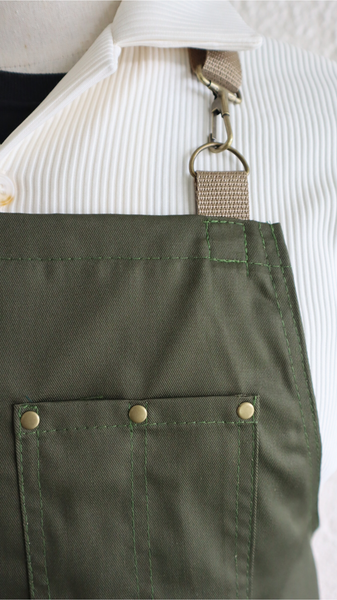 DESCRIPCIÓN: Delantal de cuerpo completo en tela twill de algodón verde olivo y detalles en color crema. Diseño en material liviano con bolsillo funcionales perfecto para el día a dia. Disponible en largo de rodilla y largo mitad de muslo.